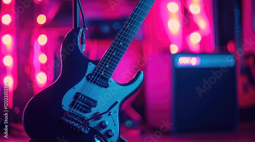 Obraz premium Electric Guitar on Stage, Pink and Blue Lights, Concert Ready