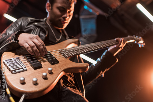 Fototapeta premium Electric guitar player playing hard rock music with bass guitar on stage