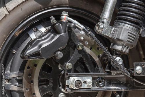 Obraz premium electric motorcycle rear wheel, brake disc and caliper, close up