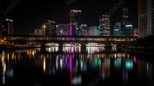 © Akash, Fototapeta premium Electric Nights' Vibrant Neon Cityscape, Brimming with Energy and Movement, Captured with Precision and Artistry, to Bring the Thrilling Energy of the City Into Your Home or Workspace. Generative AI