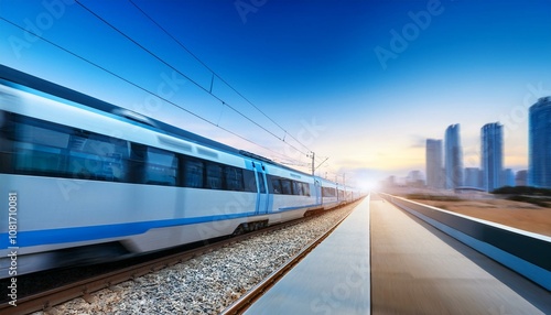 Fototapeta premium electric passenger train Drive at high speed amidst the urban landscape.