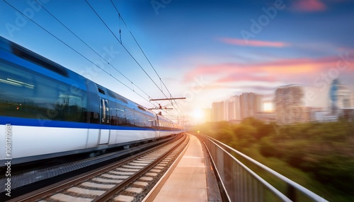 © ek, Fototapeta premium electric passenger train Drive at high speed amidst the urban landscape.