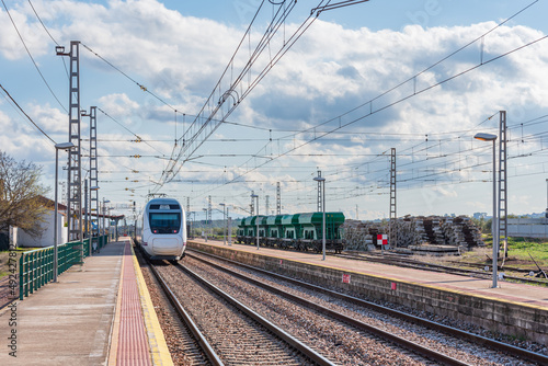 © M. Perfectti, Fototapeta premium Electric passenger train waiting next to the platform, in front of some bulk cargo cars.
