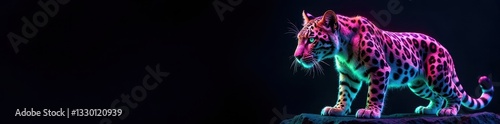 Naklejka premium Electric pink, green, & blue neon leopard; intense black background ,...