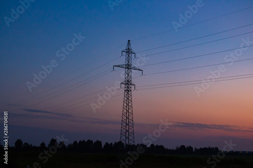 © Black_Cherry_Spb, Fototapeta premium electric poles on the background of sunrise