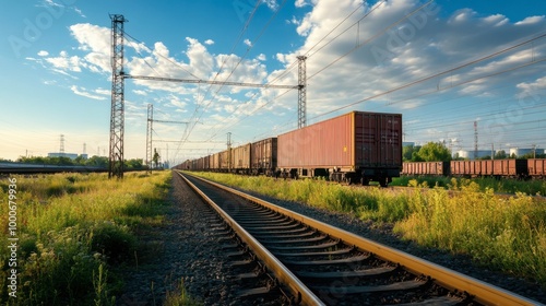 © phattharabodin, Fototapeta premium Electric poles running alongside a railway line cutting through an industrial area, with freight trains passing by.