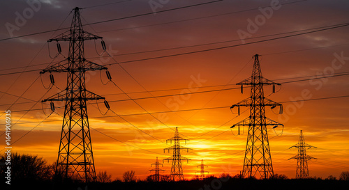 Fototapeta premium Electric Power Lines Stretching Across Sunset Sky – Power Transmission and...