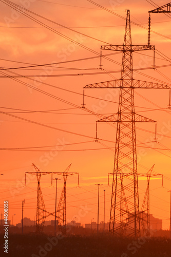 © konstan, Fototapeta premium Electric power transmission lines at sunset