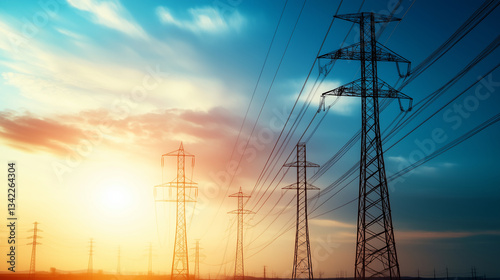 © Maksym, Fototapeta premium Electric pylons standing tall in a row, disappearing into the horizon, with power cables vibrating in the wind, symbolizing the expansion of electricity networks.