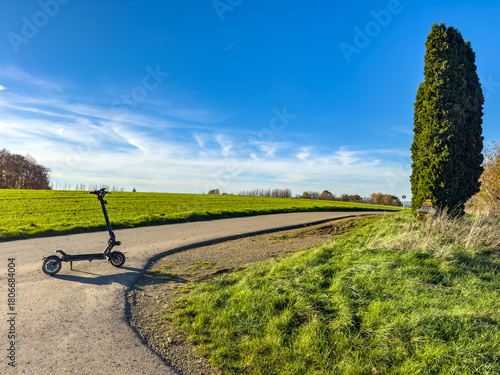 © Jarmado, Fototapeta premium Electric scooter parked on a winding country road beside a tall cypress, fresh green grass and wide blue sky. Peaceful countryside scene in Luxembourg.