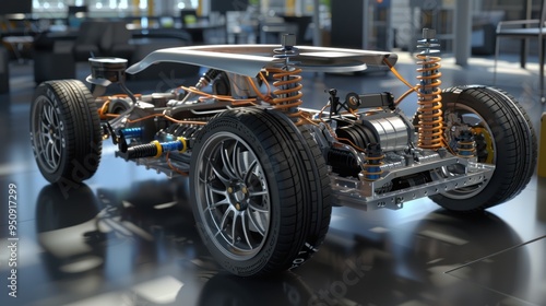 © Shozib, Fototapeta premium Electric sports car chassis with exposed structure on factory floor