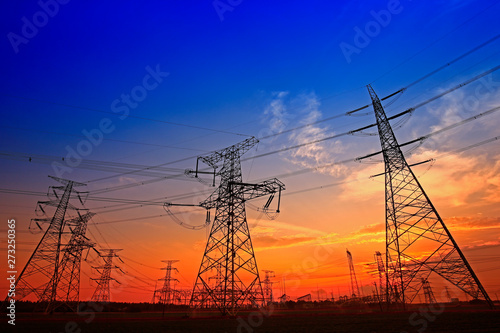 Fototapeta premium Electric tower, silhouette at sunset