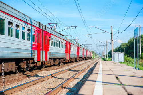 © Kiryakova Anna, Fototapeta premium Electric train pulls up to the station platform