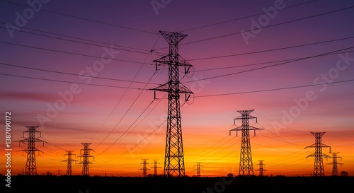 Fototapeta premium Electric Transmission Towers at Sunset: A Vibrant Landscape Photograph AI...