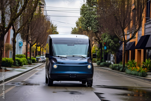 © MaxSafaniuk, Obraz premium Electric Van Delivering on road. Driver of Electric cargo van delivers the parcel to the customer. Modern Delivery truck. Electric delivery van in New York City. Ai Generative illustration.