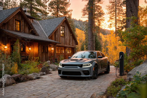 © Yurii Semonov, Fototapeta premium Electric vehicle charging station at residential curb with house in soft focus