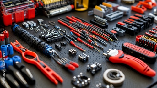 Fototapeta premium Electrical Connectors Wires and Tools on a Black Surface