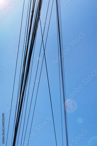Obraz premium Electrical wires with blue sky for background