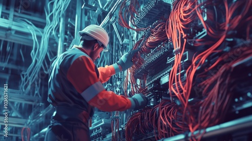 © Johannes, Obraz premium electrician and engineer work on an electrical circuit with many cables for communication and data transfer
