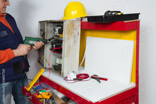 Fototapeta premium electrician fixing electrical system with different tools