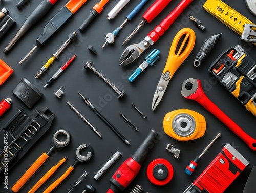 © Hafiz, Fototapeta premium Electrician tools flat lay with led lighting and space for branding