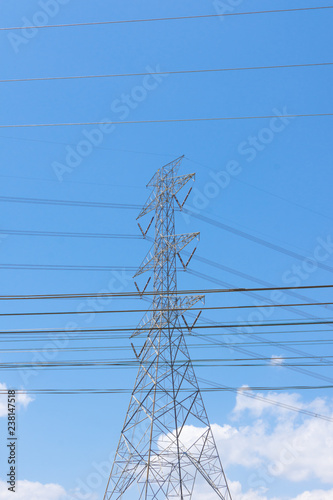 © Pataradon, Fototapeta premium Electricity concept. Close up high voltage power lines station.