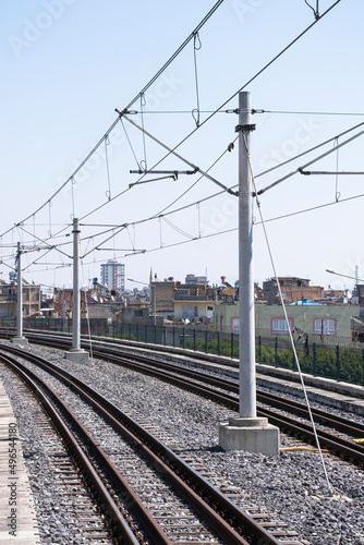 © mustafaoncul, Fototapeta premium Electricity mast and energy cables of a train route. rail transportation,
