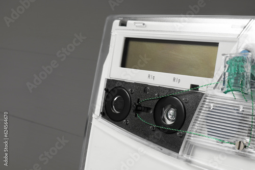 © New Africa, Fototapeta premium Electricity meter on grey wooden wall, closeup and space for text