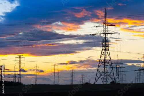 © Michaela Jílková, Fototapeta premium Electricity - Power energy Industry - Electric poles at the sunset with coloful sky