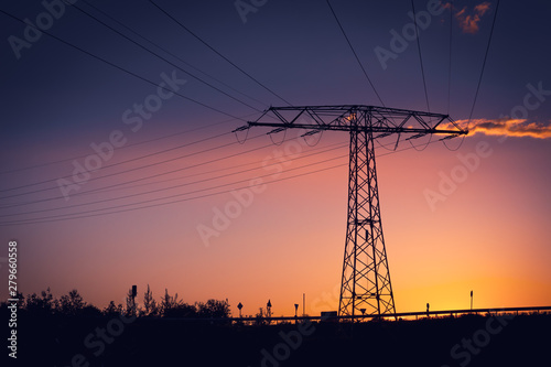 © funkenzauber, Fototapeta premium Electricity pylon silhouetted against a sunset