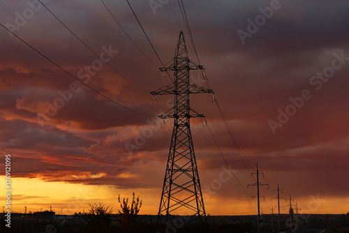 © Nomad Pixel, Fototapeta premium Electricity pylons at sunset. Electricity distribution station. Energy industry.