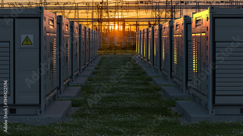 Obraz premium Electricity storage facilities against the backdrop of high-voltage...