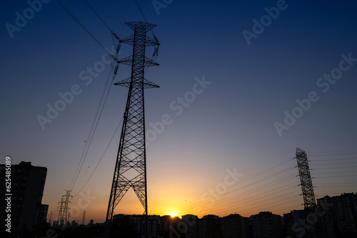 Fototapeta premium Electricity transmission tower with sunset