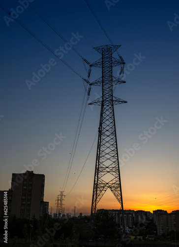 Fototapeta premium Electricity transmission tower with sunset
