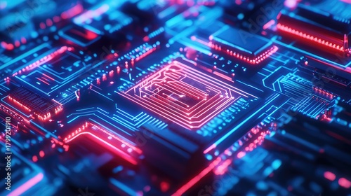 Fototapeta premium Electronic circuit board processing data with glowing neon lights