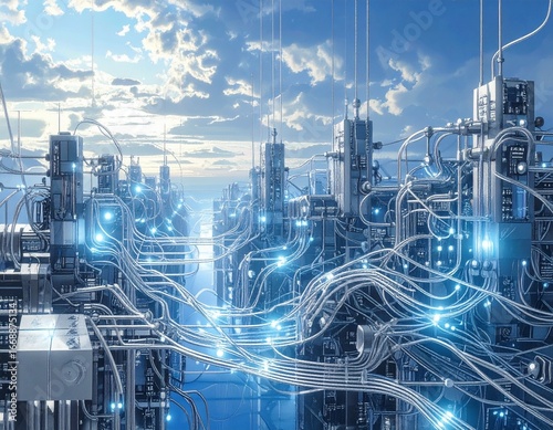 Fototapeta premium Electronic circuit 3D with pulsing lights and intertwined wires