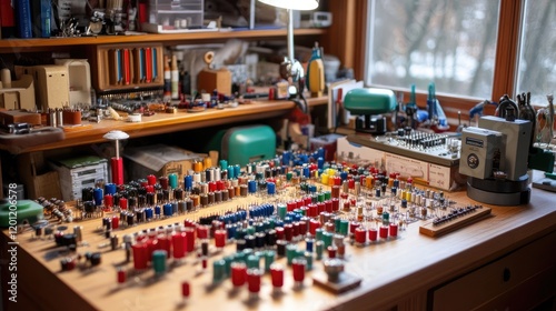 © Boonnam Burart, Fototapeta premium Electronic components such as resistors, capacitors, and transistors organized on a workbench.