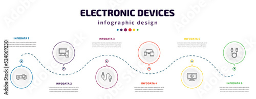 Fototapeta premium electronic devices infographic element with icons and 6 step or option. electronic devices icons such as projector, personal computer, sound cable, devices, smart tv, sata vector. can be used for