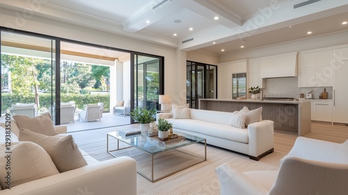 © Jaroon, Fototapeta premium Elegance and Space: a sunlit living space of a modern luxurious home with sleek design and seamless indoor-outdoor flow, glass doors open to the patio, creating an airy atmosphere.