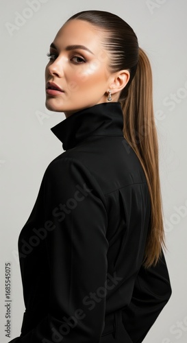Fototapeta premium Elegance in Pose: A striking woman with flowing hair strikes a pose. Her...