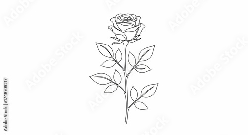 © Mateus, Obraz premium Elegance in Simplicity: A detailed monochrome line drawing of a single rose blossom on a delicate stem, exuding timeless beauty and grace.