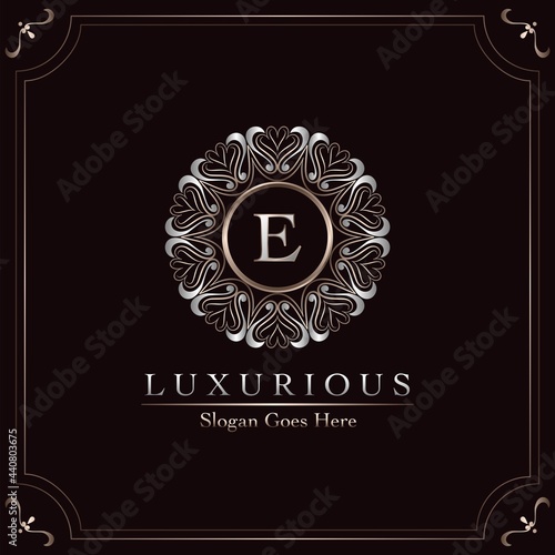 Obraz premium Elegance Ornate Luxury Mandala Badge Letter E Logo Design Decorative Frame...