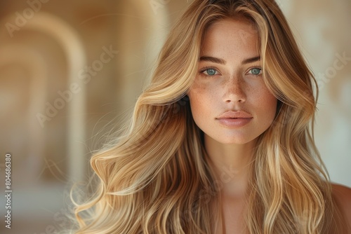 Fototapeta premium Elegance personified, this image showcases a blonde woman with soft wavy hair, combining beauty with a serene poise