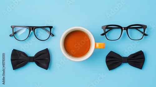 © pvl0707, Fototapeta premium Elegance Unleashed: Tea, Glasses, and a Bow Tie on Blue