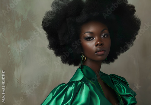 © Henryk Guziak, Obraz premium Elegancka kobieta w zielonej satynowej sukni z naturalnymi włosami afro – portret z klasą i modowym wyrazem