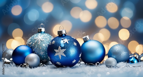 Fototapeta premium Eleganckie, niebieskie i srebrne ozdoby świąteczne, zdobione płatkami śniegu,...