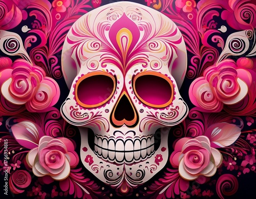 © Diane, Naklejka premium elegant abstract background featuring sugar skull motifs with vibrant pink and white floral swirls in a modern minimalist style