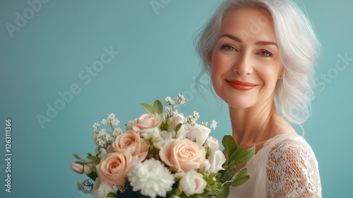 © SerPhoto, Naklejka premium Elegant adult woman smiling while holding a beautiful bouquet of flowers on a light blue background