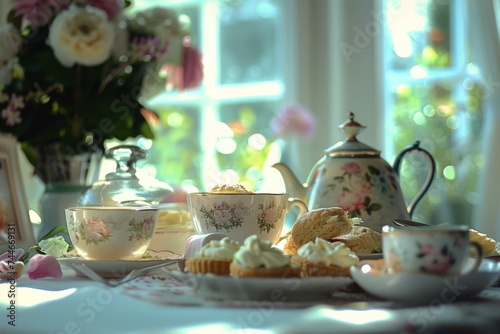 Fototapeta premium Elegant Afternoon Tea Setup with Pastries, Home Comfort Concept