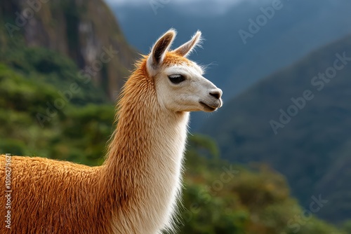 © isz, Obraz premium Elegant Alpaca Standing against Majestic Mountain Landscape